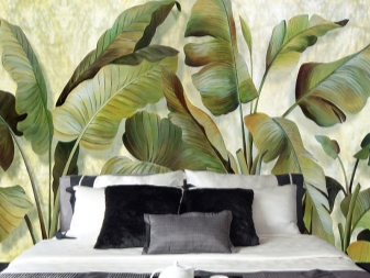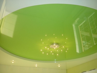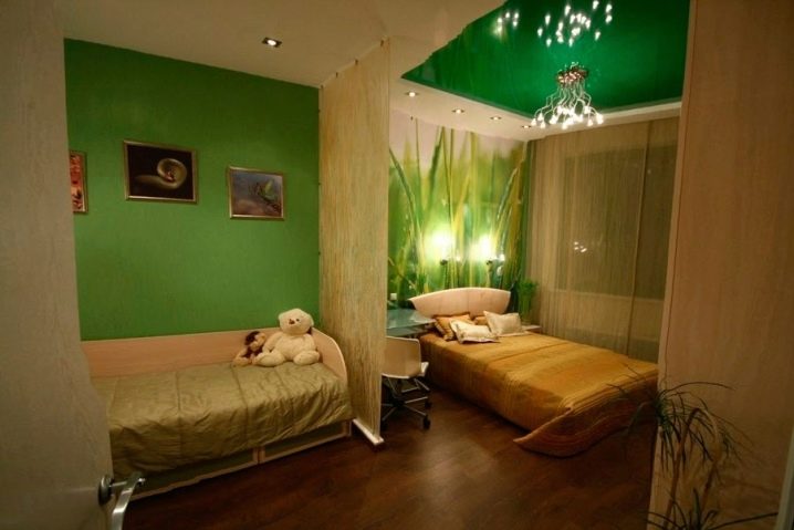 За да зонирате пространството, използвайте различни нюанси на този благороден цвят. За детската стая можете да изберете по -ярки акценти, а за зоната за отдих на родителите са подходящи по -светли тонове. Ако ги комбинирате с лъскави опънати тавани с наситен зелен цвят, получавате много уютна стая. Той ще бъде допълнен от фототапети с изображения на растения и малки LED лампи на тавана..
