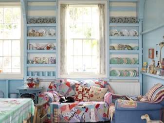 Тук има и такива елементи като рюши и волани с дантела, пера, пискюли. Декоративна възглавница, бродирана с мъниста или пайети, ще бъде ярко допълнение към хола в селски стил.