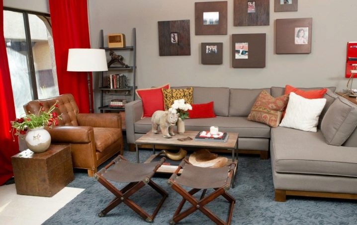 - Кръгли, както и стандартни правоъгълни извити изделия се поставят на ъглов диван. Това ви позволява визуално да скриете геометрията на този вид мебели и да го управлявате по -удобно (ъглите на дивана не се впиват в тялото, когато седите върху него).