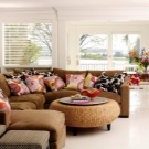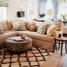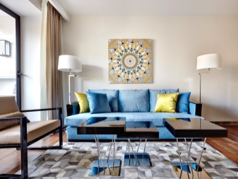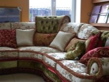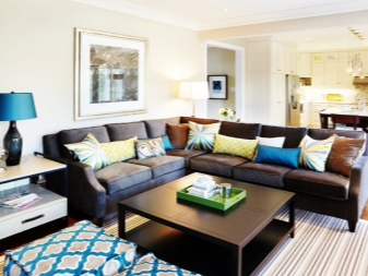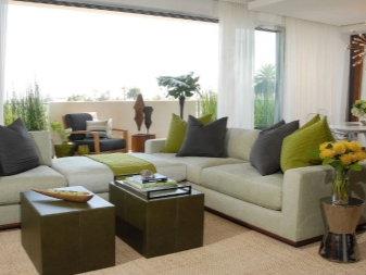- Кръгли, както и стандартни правоъгълни извити изделия се поставят на ъглов диван. Това ви позволява визуално да скриете геометрията на този вид мебели и да го управлявате по -удобно (ъглите на дивана не се впиват в тялото, когато седите върху него).