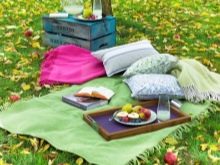- Вземете малки възглавници и пикник. Но тук тяхната роля изобщо не е декоративна. Те се побират върху седалките на сгъваеми столове, фотьойли и табуретки за по -голяма мекота и комфорт.