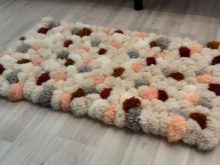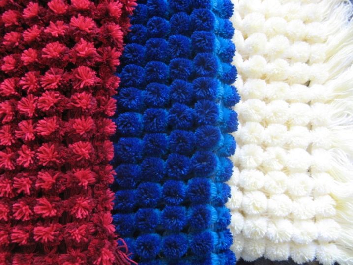 Изборът на цвят на помпоните килими няма граници. Всичко зависи от предпочитанията на майсторките или желанията на клиента. По принцип това са нежни и приятни за окото нюанси на пастелната група. Такива покривки са направени за новородени и малки деца в предучилищна възраст. Сред най -популярните нюанси са популярни розово, синьо, бяло, лилаво, светло зелено, цвят мента и тяхната смес под формата на меланжева прежда с помпон.. По отношение на моделите за тийнейджъри и възрастни, наситените цветове са с приоритет: синьо, оранжево, червено, топли пясъчни и теракотни тонове.