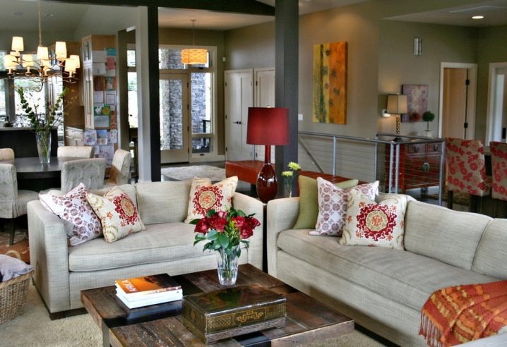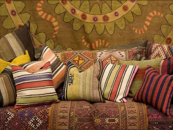 Добре подбраните покрития за гоблени могат да трансформират скучен интериор. Ярките възглавници, небрежно разпръснати по дивана, не само ще зарадват окото, но и ще направят стаята по -удобна..