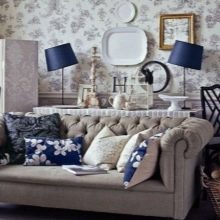 Интериорът е много украсен с репродукции на известни картини и архитектурни паметници. Ще бъде интересно да разгледаме дизайна на стаята, където има няколко детайла от гоблена. Освен това те трябва да се припокриват един с друг не само по цвят, но и по тематика. Например, ако стената е украсена с изображение на Колизеума, тогава можете да изберете колесници с коне или статуи на римски богове като изображения за кориците..
