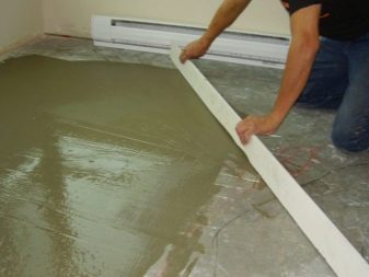 От ъгъла срещу вратата започват да лежат двама души. Работата на единия е да запълни и изглади, вторият омесва следващата порция разтвор. Най -добрият вариант е зона с параметри от половин метър. Преди това стаята е разделена на линии с дължина около 40-50 см с дървени дъски за маяци, така че повърхността да е по-лесна за изравняване. Изсипете повърхността по тях.