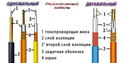 - Резидент, тоест излъчва топлина равномерно. Разграничаване на едножилни и двужилни кабели, всички те се характеризират с постоянно съпротивление;