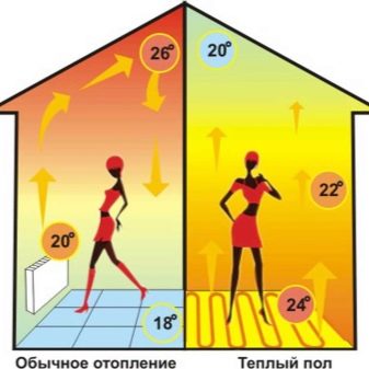 - Използването на електрическо подово отопление ви позволява да постигнете оптималната температура на въздуха в помещението за здраве: на разстояние 20-30 см от пода температурата достига комфортни 24 градуса, докато в горната част е 18-20С;