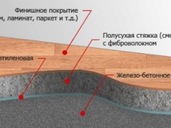 На практика често се използва суха замазка, която трябва да се извърши от опитен специалист. Изводът е да се използва сух насипен пълнител – експандирана глина (експандиран пясък) и полагане на листове от гипсови влакна.