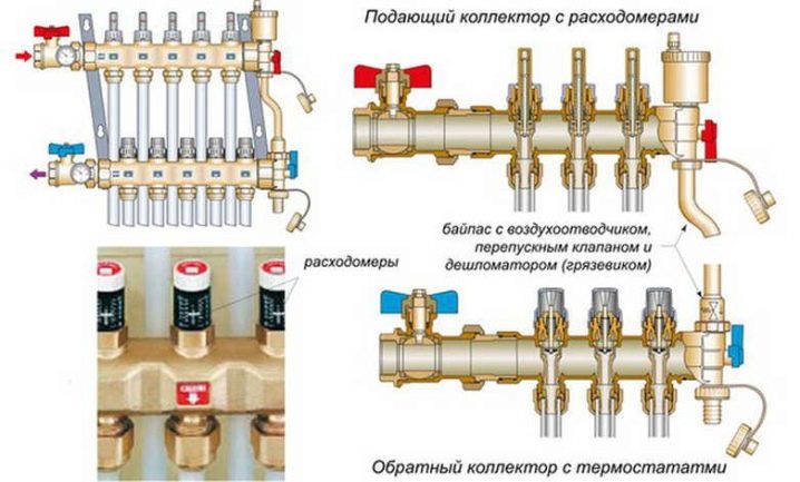 Колекторът, с помощта на който водата навлиза в тръбопровода, понякога се нарича сплитер. Едно от тези устройства сортира топлата вода по отоплителните кръгове, а другото я събира след преминаване през цялата система. И двете устройства са поставени в шкаф на колектора. Висококачественото представяне на групата за събиране включва също: