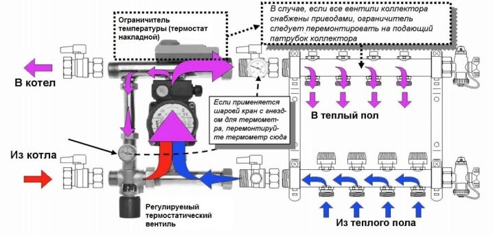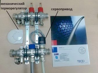За да се осигури смесването на топла и студена течност за пренос на топлина, се използват термостатични смесители. Те са двупосочни (сдвоени конструкции се поставят върху захранващите и връщащите тръби) и трипътни (с добавяне на електрическо задвижване, те се монтират на изхода на котела). Погрижете се за наличието на серво задвижване, термостат: инвестициите в тези устройства са оправдани от факта, че ще бъде по -удобно да използвате системата. Сервомоторите се поставят върху гребените за водоснабдяване.