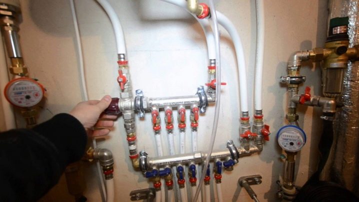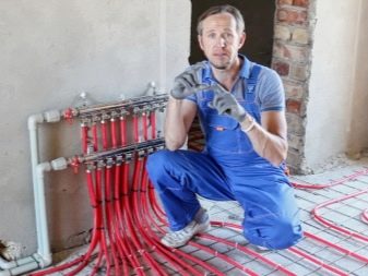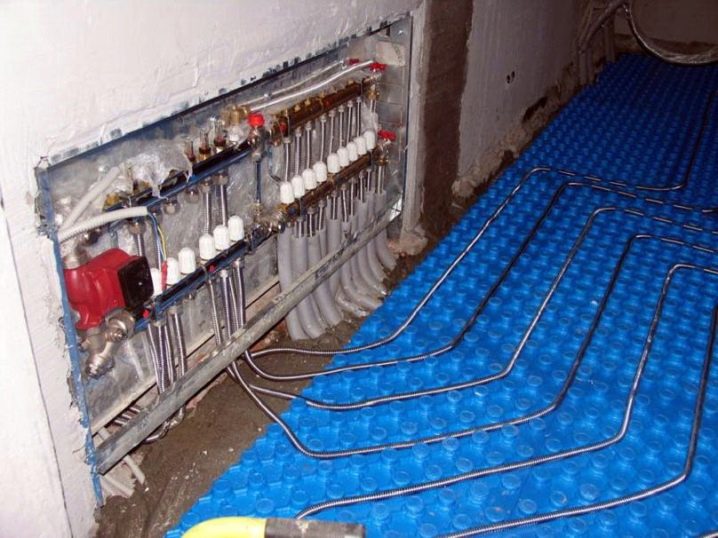 Свързването на тръби към колектора включва използването на компресионни фитинги или устройства Eurocone. Ако е необходимо, можете да прокарате такива тръби през стените, да ги затворите от всички страни с изолационен слой от разпенен полиетилен. Когато всички части са прибрани и всяко устройство е свързано на правилното място, системата трябва да бъде тествана. След подаване на вода към тръбите, те се държат под налягане от 5 или 6 бара в продължение на 24 часа (в зависимост от проектната експлоатационна стойност). Ако такава проверка не доведе до появата на визуално забележими разширения, можете спокойно да продължите с изливането на бетонния слой.