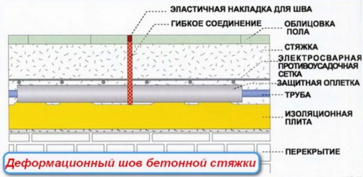 За проектирането на замазки е позволено да се използва цименто-пясъчна смес на основата на портланд цимент (най-малко М-400, а още по-добре, използвайте М-500). Когато се използва готов бетон, неговият клас трябва да бъде M-350 и по-висок. В допълнение към полагането на амортисьорната лента, армиращата мрежа се разделя там, където преминава шевът. Дебелината на всеки шев е 1 см, а горната част е обработена с уплътнител. При преминаване на тръби на тези места те трябва да се поставят само във външната гофрирана тръба.