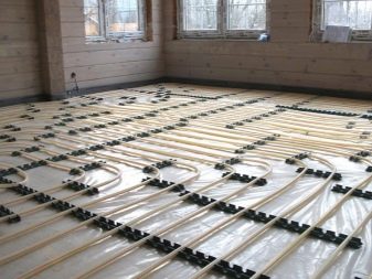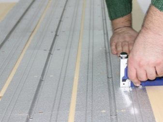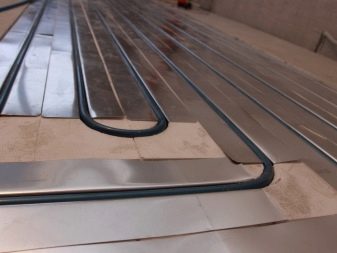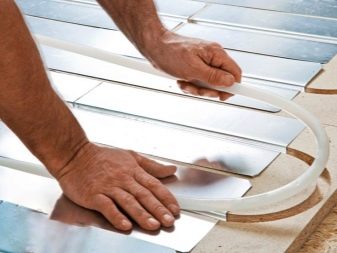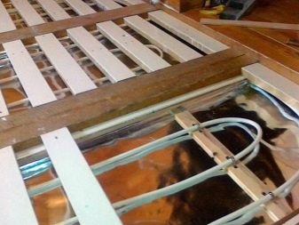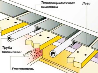 Налагането върху подовата настилка предполага също поставяне на изолация в пробивите на трупите върху хидроизолацията, а отгоре се поставят шперплат или дъски за теглене. Нюанс: смилайте дъските, така че да се появят канали за полагане на тръби. Отразяващият слой е направен от фолио, прикрепено към дъските с помощта на телбод. Тръбите в каналите се държат от тесни метални плочи, поставени отгоре, самите плочи също са прикрепени към дъските.