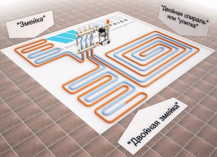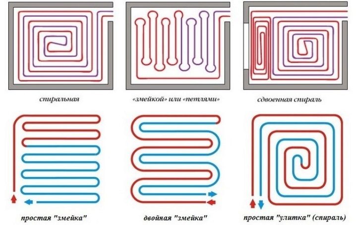 Монтажът по схемата “охлюв” или “спирала” се препоръчва за големи помещения и прави отоплението по -равномерно. Класическата „змия“ се проявява най-добре в малки помещения, а ако искате да подадете топлина към подовата настилка в помещение със средни размери, препоръчително е да предпочетете „двойната змия“, в която горещата и връщащата тръба са успоредни.