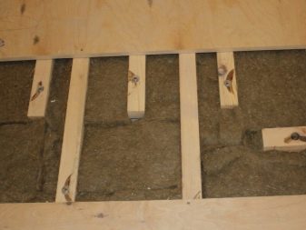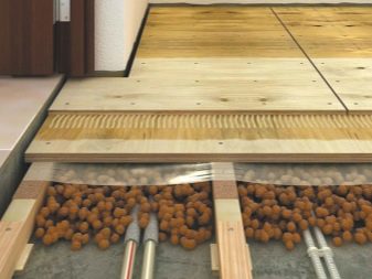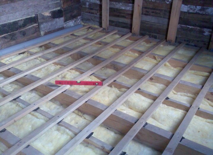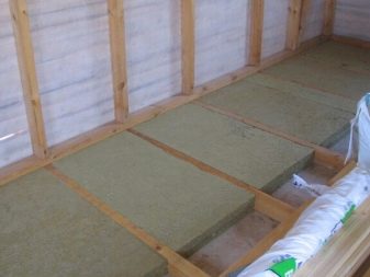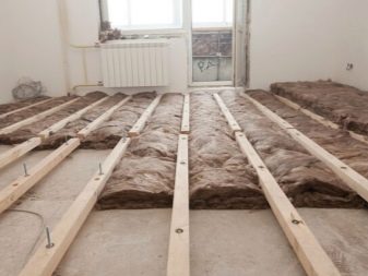 Изолация на пода, подредена по трупите, може да се направи с различни нагреватели: дървени стърготини, експандирана глина, минерална вата: