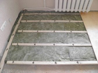 Най -лесният вариант за подови настилки върху трупи. Първо върху основата се полага хидроизолационен материал (пергамин, покривен филц, покривен филц, полиетилен или полимерна мембрана). След това поставете лентите за изоставане и ги поставете на ниво. Между тях се полага изолация (експандирана глина, дървени стърготини, полистирол, експандиран полистирол, минерална вата).