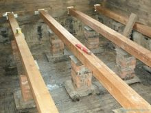- За да спестите пари, когато монтирате пода на земята, можете да намалите обхвата на трупа, като инсталирате колони, за да поддържате дървения материал с по -малка секция. Подпорите са най -добре направени от тухлена тухла и монтирани на разстояние 1,2 м една от друга. Възможно е също да се използват силикатни тухли, но само ако вероятността от покачване на подпочвените води е минимална.