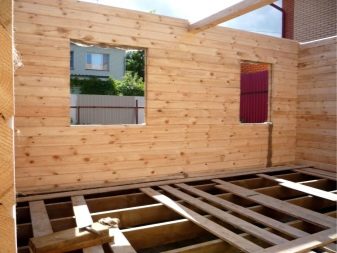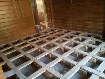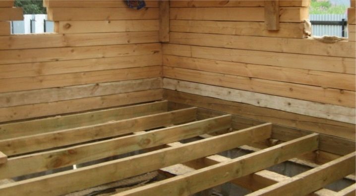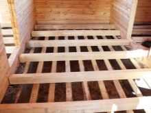 Дървените трупи се обработват с антисептичен разтвор и се потапят в постелката със задължителното закрепване към основата на основата. След това се полагат подовите дъски.