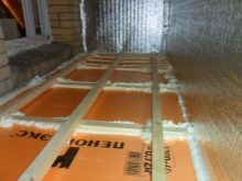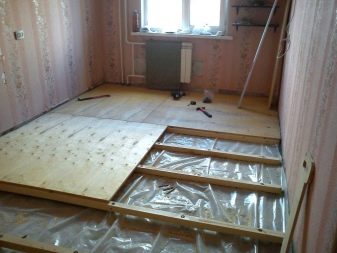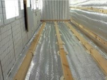 По-нататък върху трупите се полага пароизолационен филм с припокриване, със задължителното залепване на фугите, който се закрепва към трупите с прът. Подовите дъски се поставят отгоре.