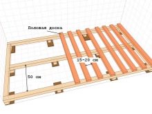 - Когато избирате дървен материал, не забравяйте да вземете предвид наличието на поне 2-сантиметрова вентилационна междина, тоест трябва да се има предвид, че при полагане на изолация между долната част на готовия под и горния слой на топлоизолация, трябва да има свободно място за изпаряване на получения конденз. В противен случай влагата ще започне да се абсорбира в изолацията (особено ако е хигроскопична), което ще доведе до загуба на нейните експлоатационни свойства. И когато полагате пръчка върху наземна основа, е необходимо да вземете предвид височината на ролката, прикрепена към черепната шина