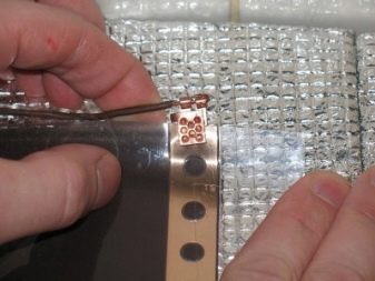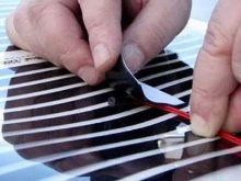 След това трябва да фиксирате лентите от филм помежду си с помощта на обикновена лента. Това е необходимо, за да се избегнат “движения” на конструкцията по време на по -нататъшни монтажни работи. Сега трябва да свържете проводника към специалната клема, която инсталирахме малко по -рано. Също така трябва да се изстиска с клещи..