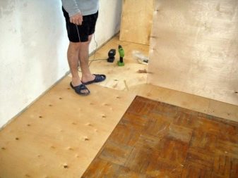 Най -често хората избират да подравнят такива конструкции с шперплат, тъй като разликите между дървените подови дъски често стават много впечатляващи. За такава работа се препоръчва използването на шперплат със стандартни размери. Разрязва се на 4 части. Рязането трябва да се извършва много внимателно, за да не се появи разслояване по краищата на листовете..