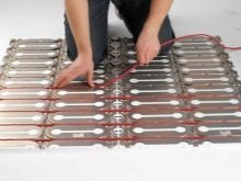 - Простота в изчисленията и лекота на инсталиране. Минималното разстояние между профилите е 12,5 см, следователно, като знаете точното им тегло, можете бързо да изчислите разхода на материал. За монтаж и закрепване на тръби не е необходимо да се използва подсилваща мрежа, те се полагат директно върху нагревателните плочи.