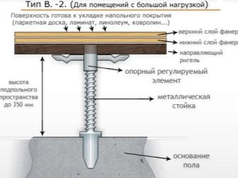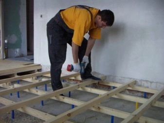 Най -подходящият вариант за изравняване на повърхността по трупите е регулируем под. Принципът на действие на този метод се състои в това, че в трупите са направени прорези, в тях се завинтват пластмасови втулки, което ви позволява да регулирате височината на пода. Фиксирането на втулките в дневника се извършва с помощта на няколко винта. След това трупите трябва да бъдат прикрепени към бетона, върху който трябва да направите маркировки за бъдещи дупки. Използвайки пирони, трябва да прикрепите прътите към основата. Отгоре се завинтват листове от шперплат.