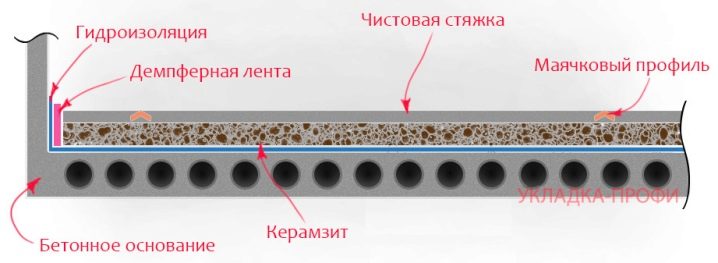 Първият вариант предвижда комбинация от възглавница от експандирана глина с използването на циментова замазка. Първо експандираната глина се излива върху основата в равен слой, след което се проверява колко равномерно е поставена изолацията. След това трябва внимателно да поставите приготвения разтвор..