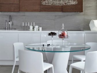 Светлосивите подове, комбинирани със стени с подобен нюанс, подчертани с бели мебели в зоната за хранене, създават впечатление за чисто и светло кухненско пространство. Акценти под формата на кафяви кухненски врати, стъклен плот и необичаен полилей допълват избраната визия..