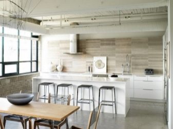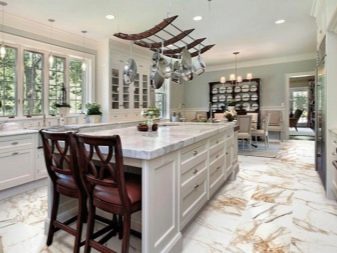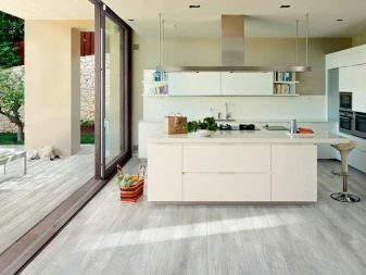 - За кухнята и трапезарията е по -добре да изберете подови настилки от порцеланов камък. Тук не се препоръчва да се монтира дървен под или ламинат. Прегледите на обикновените хора потвърждават непрактичността на такова покритие в тази област..