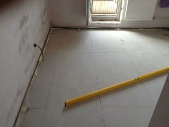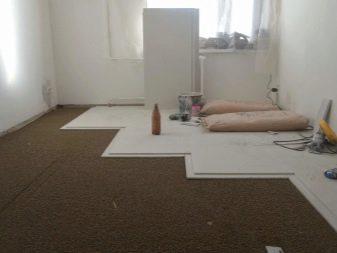- Подова настилка. Според принципа на пълнене, той се извършва от далечния ъгъл на стаята до входната врата. Листовете Knauf се фиксират със самонарезни винтове.