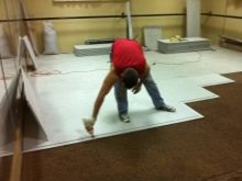 - Подготвителна работа. Цялото старо покритие се отстранява напълно, след което повърхността се изследва за дефекти. Ако се открият недостатъци, те трябва да бъдат запълнени с цименто-пясъчен разтвор в съотношение 1 към 3.