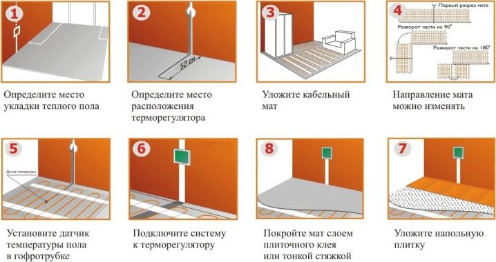 Дебелината на отоплителното ядро е само 3 мм, което дава възможност да се монтира пода както сух (директно под ламината), така и мокър (например в залепващия слой от плочки). Цената на отоплителните рогозки е по -висока, отколкото при обикновен кабелен подово отопление, но те също имат повече предимства: монтажът е прост и постелката се загрява по -бързо, тъй като кабелът е по -близо до повърхността.