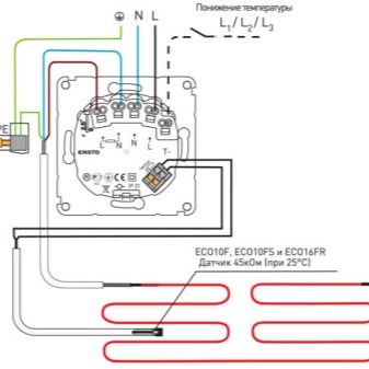 Електронният термостат е свързан съгласно схемата, посочена от производителя върху кутията. В близост до клемите, предназначени за определен проводник, има индикации: два терминала за сензора за температурата на пода, три за захранващия кабел (фаза, нула и заземяване) и два за нагревателния кабел на най-топлия под (за двупроводен използва 2 проводника, за едножичен, съответно един).