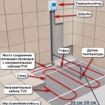 След това трябва да инсталирате термичен сензор, той трябва да бъде поставен в специална пластмасова тръба. Ще бъде възможно да се провери функционирането на кабелното подово отопление едва след като бетонната замазка изсъхне напълно. Необходимо е да свържете проводниците, захранващи цялата система, захранващите проводници за нагревателния кабел, както и проводника на температурния сензор.
