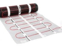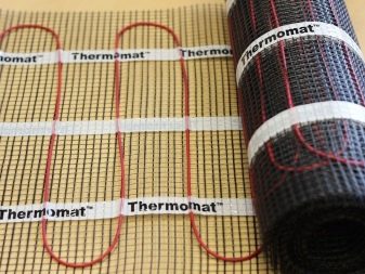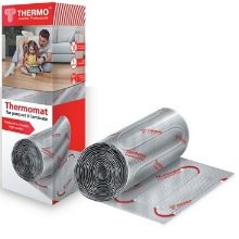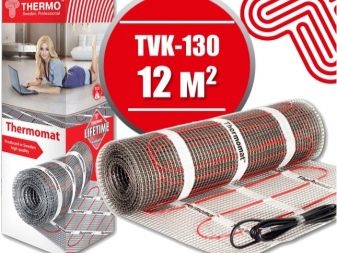 Вторият тип подове се нарича Термомат. Той се основава на специални рогозки, за монтажа на които не е необходимо да се оборудва бетоно-циментова замазка. Достатъчно е да се използва саморазливна смес, която се нанася в слой с дебелина 4 мм. Можете да го замените с лепило за плочки. Максималната работна мощност на отоплителните постелки е 180 W / кв. м.