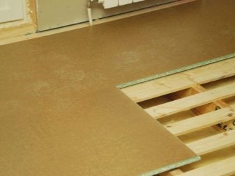 След това можете да поставите ПДЧ. Те започват да се покриват от противоположната страна на стаята от изхода. Положеният панел се фиксира с самонарезни винтове, първият от които се завинтва в центъра, а останалите по ръбовете, за да се осигури равномерно полагане на покритието. Главата на винта не трябва да излиза над повърхността, затова е препоръчително да я удавите поне 1 мм. Площта на един лист трябва да покрива най -малко три изоставания, за да не се загуби твърдостта и да не се огъне.