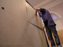 Отгоре изсушеният гипс е покрит с изолация и покрит с експандирана глина. След това плочите, навлажнени с антисептик, се поставят една след друга на разстояние около 2 см от стената. Инсталацията, както и изливането, започва от противоположния ръб на стаята..