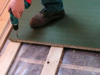 След това можете да поставите ПДЧ. Те започват да се покриват от противоположната страна на стаята от изхода. Положеният панел се фиксира с самонарезни винтове, първият от които се завинтва в центъра, а останалите по ръбовете, за да се осигури равномерно полагане на покритието. Главата на винта не трябва да излиза над повърхността, затова е препоръчително да я удавите поне 1 мм. Площта на един лист трябва да покрива най -малко три изоставания, за да не се загуби твърдостта и да не се огъне.