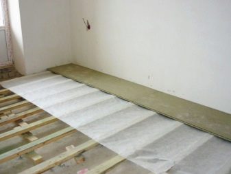 Първо, трупи от бара се монтират върху бетонна замазка, разстоянието между които се определя от дебелината на плочите. При дебелина на листа от 16 мм, гредите трябва да бъдат положени на разстояние 30-40 см, а с дебелина 22 мм – до 60 см. Нивото на пода е посочено на стената с молив. Вдлъбнатините и кухините в бетона ще трябва да бъдат запълнени с пясък. По периметъра близо до стените е наложително да се остави малка междина от 20 мм. Ако е необходимо, допълнително изолирайте пода. Върху бетона под гредите се облицова слой хидроизолация, а между гредите се полага пяна или стъклена вата.