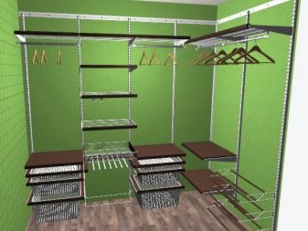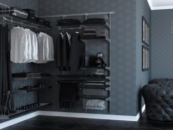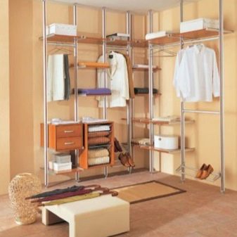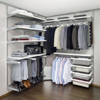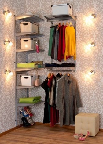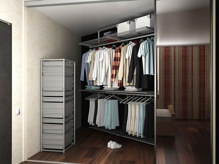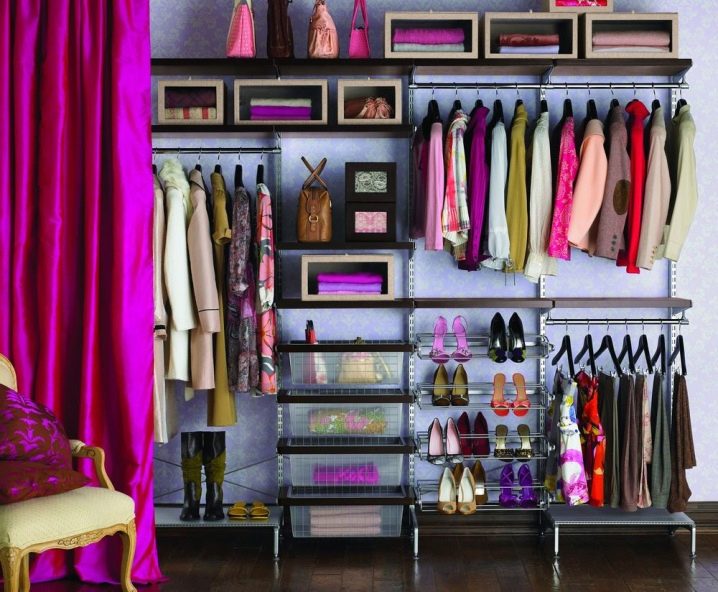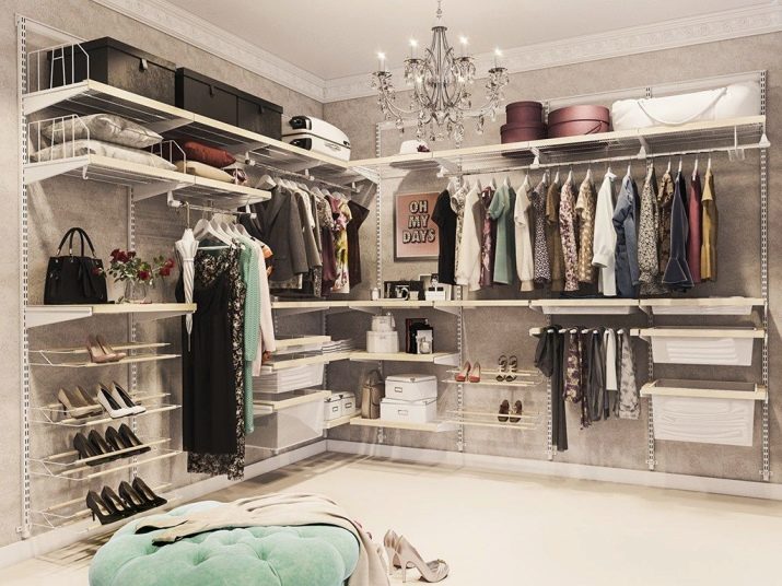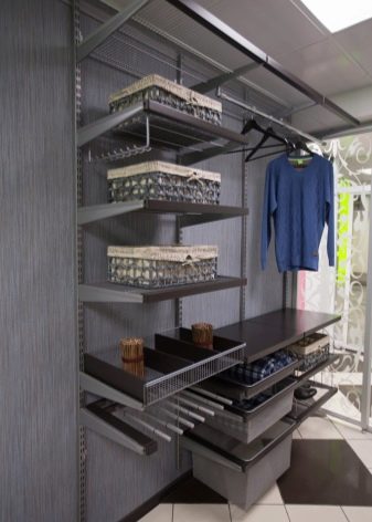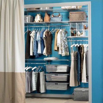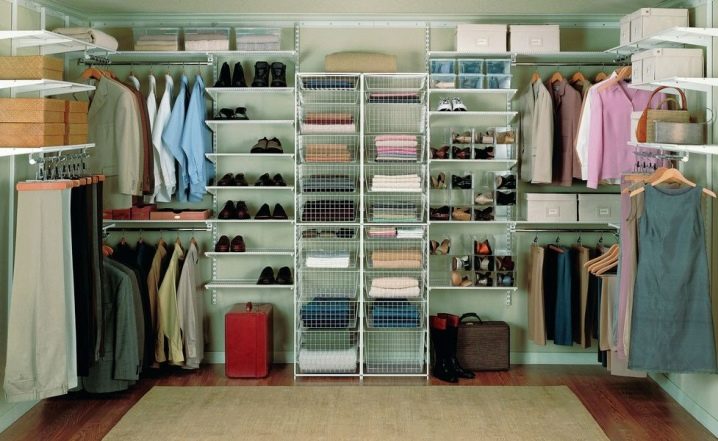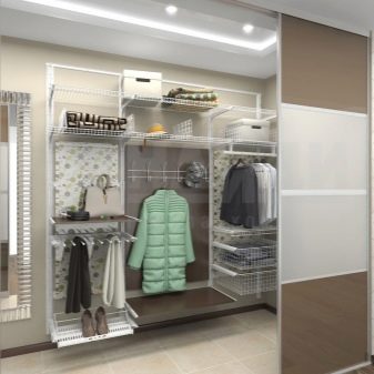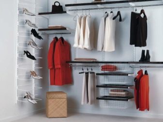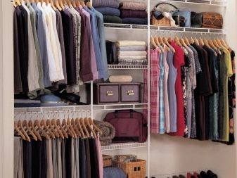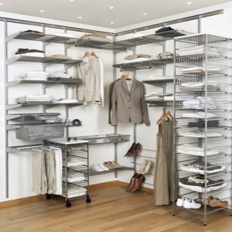 Характеристика на съвременните гардероби е липсата на празни стени, огради. Полезни са и мрежестите кошници, които осигуряват отлична вентилация. По този начин никакви дрехи няма да поемат неприятни миризми и ще запазят чистия си вид за дълго време. С подобен дизайн също не е нужно да говорите за молци, дървеници. Повече светлина ще влезе в съблекалнята, което ще изплаши насекомите.