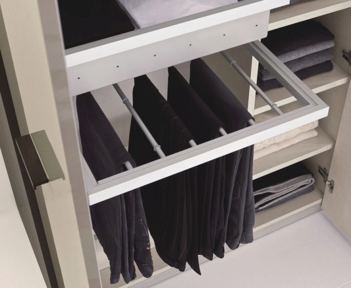 Всяка изтегляща се кошница може да бъде изработена от здрава мрежеста тъкан. Дълбочината му варира от 8,18 до 28 см. Такъв малък детайл като панталона е направен в луксозен платинен цвят, съчетан с бял. Това ще ви позволи да не набръчкате нито едно от нещата си и винаги да сте готови за утрешния работен ден..