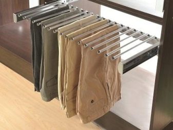 Ако работите в офис, а панталоните са необходим елемент от гардероба ви, то вътре в съблекалнята ви трябва да има панталони. С помощта на тези елементи можете да забравите за неудобните закачалки завинаги. Прибиращи се панталони са изработени от здрав метал, покрит с нехлъзгащ се материал. Благодарение на това ще спрете да се притеснявате от факта, че панталоните ще паднат и ще се набръчкат. По ваше желание съблекалнята може да съдържа толкова секции за панталони, колкото ви е необходимо.