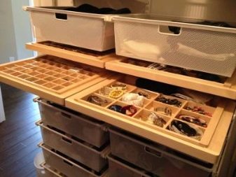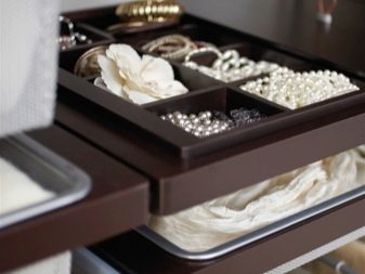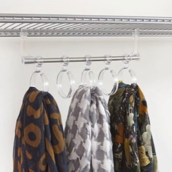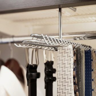 Правилното съхранение на вратовръзки, шалове и колани ще позволи специални елементи, които им позволяват хармонично да ги разпределят по цветове, форми и размери. Необходимата вратовръзка или шал винаги ще бъдат на лице и няма да се налага да страдате дълго време, за да намерите необходимия аксесоар. Този пълнител за гардеробната система може да бъде вграден или мобилен. Във втория случай можете да преместите държача на всяко удобно място в гардероба си..