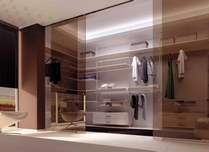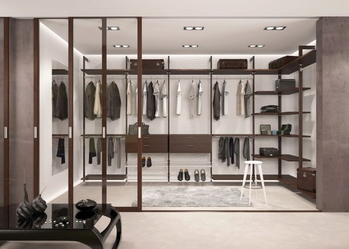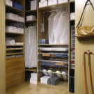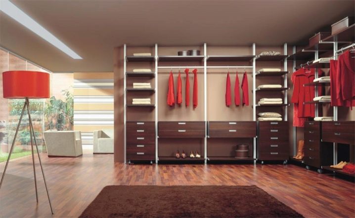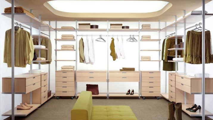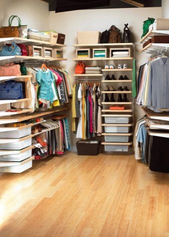 Този гардероб ще пасне на вещите на всички членове на семейството. Тук можете също да инсталирате голямо огледало, дъска за гладене, меки подплатени табуретки, тоалетка. Това е удобно, ако къщата или апартаментът са просторни и има къде да се обърнете. Разширената гардеробна система може да се използва като гардеробна. Уютно е и има възможност да се скриете от любопитни погледи..