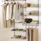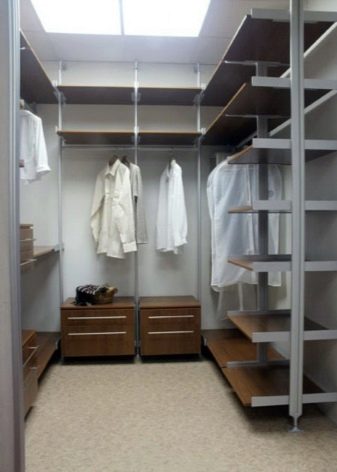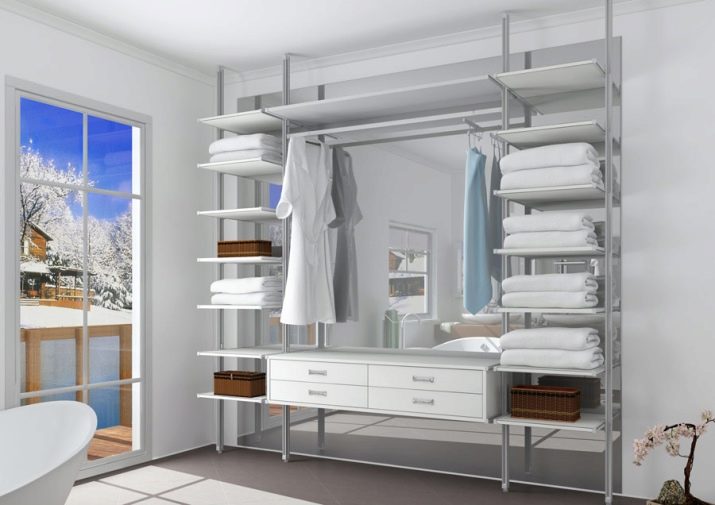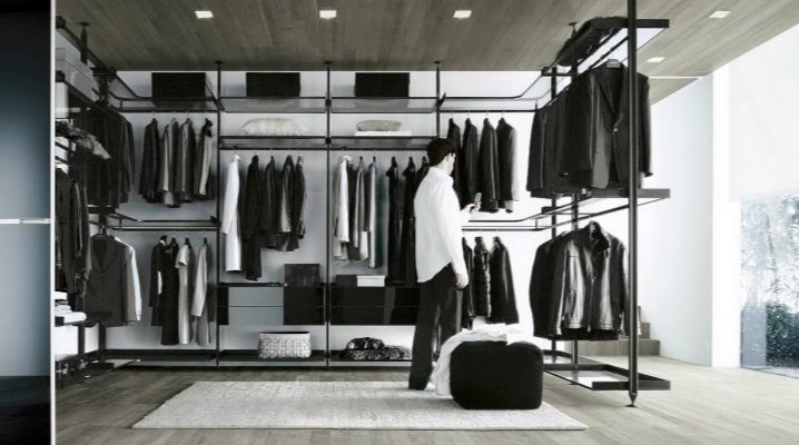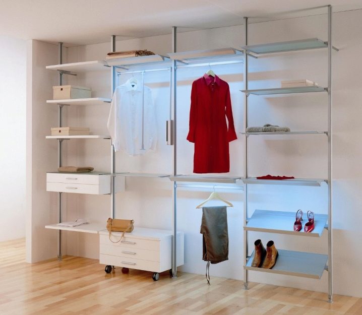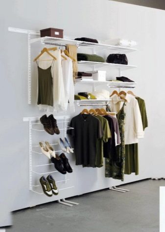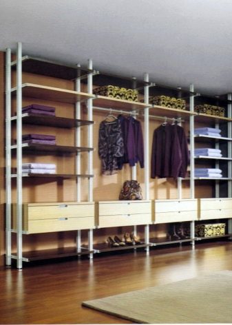 - На стелажи. Гардеробните системи на стелажите са леки и визуално ефирни. Те са чудесни за малки стаи с ограничено пространство. Стойките са изработени от алуминий, издръжливи, леки, издържат на големи натоварвания. Те се отличават с лекота на сглобяване, гъвкавост, високо качество и достъпна цена. За съхранение на вещи са предвидени барове, рафтове, мецанини. Ясните линии, елегантният и прост външен вид привличат вниманието и гарантират надеждно съхранение на всякакви предмети.