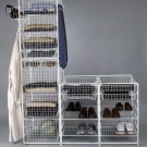 - Висящата система за съхранение се състои от много кошници и рафтове. Това е неговата основа. В допълнение към тях има поставки за обувки, класически щанги, панталони. Особеността е, че такава система може да бъде разширена с допълнителни аксесоари..
