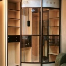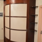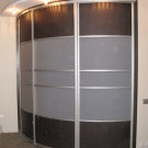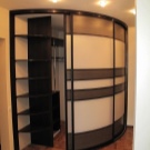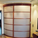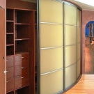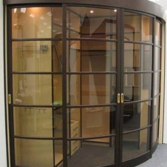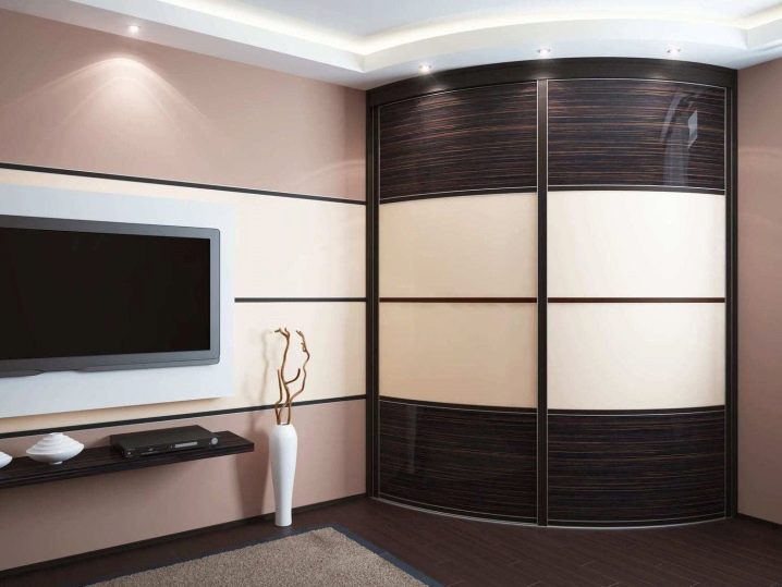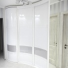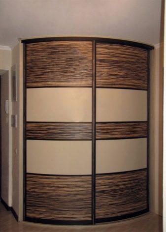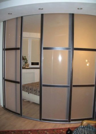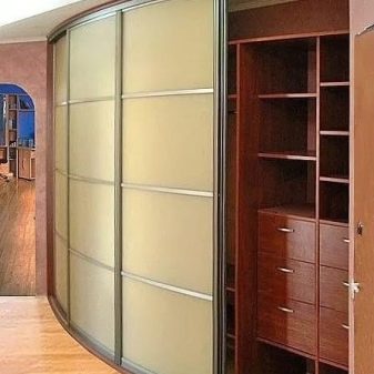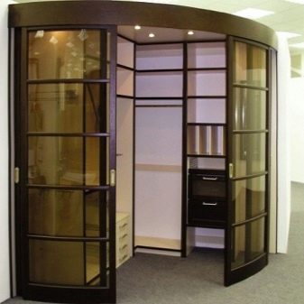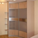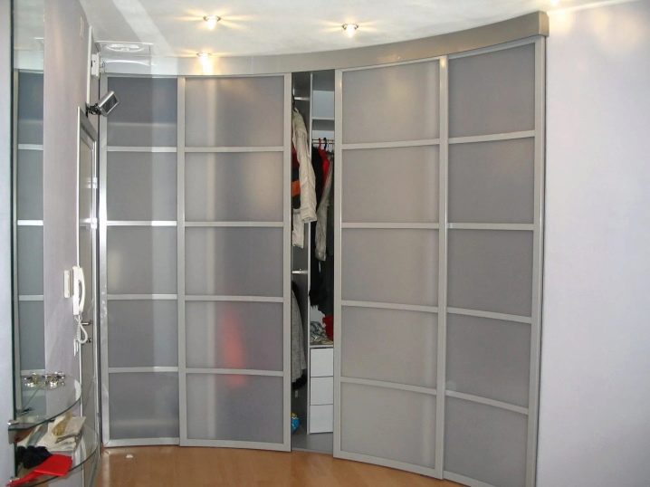 За полукръгла версия на ъглов гардероб е за предпочитане да се използва плъзгаща се врата с водачи, тъй като засяга минимум свободно пространство, удобна за използване и безопасна, особено за малки деца. Най -голямото предизвикателство тук е инсталирането на сложна система от крила със заоблени релси, чиито комплекти имат значителна цена..