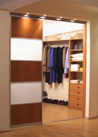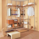 Тъй като ъгловата съблекалня има малко свободно пространство, е необходимо да проявите изобретателност и въображение, за да поберете всички изброени елементи. Най-добре е да поставите големи L-образни мебели по вътрешните стени. Например, едната страна има окачени пръти, а другата има чекмеджета и рафтове. За да спестите място, можете да използвате отделения на няколко нива. Ако няма достатъчно свободно място за огледало в цял ръст, можете да го закачите на външната стена или входните врати. Но за това ще трябва да направите люлееща се система, тъй като отвътре няма да работи, за да окачите голям огледален лист на вратата на отделението.